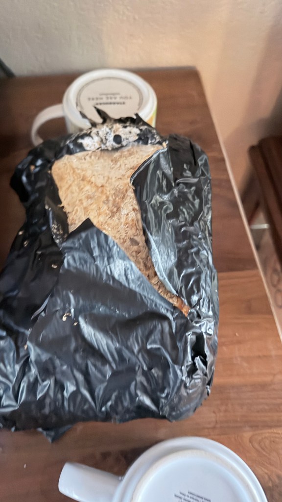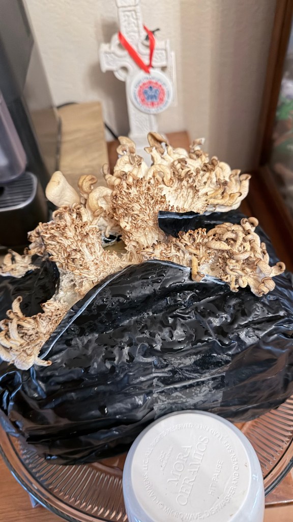 “Oh no… I’m traveling for the holidays. By car. What do we do with a growing mushroom block for a seven-hour road trip? The instructions say she needs to be misted a minimum of twice a day.”