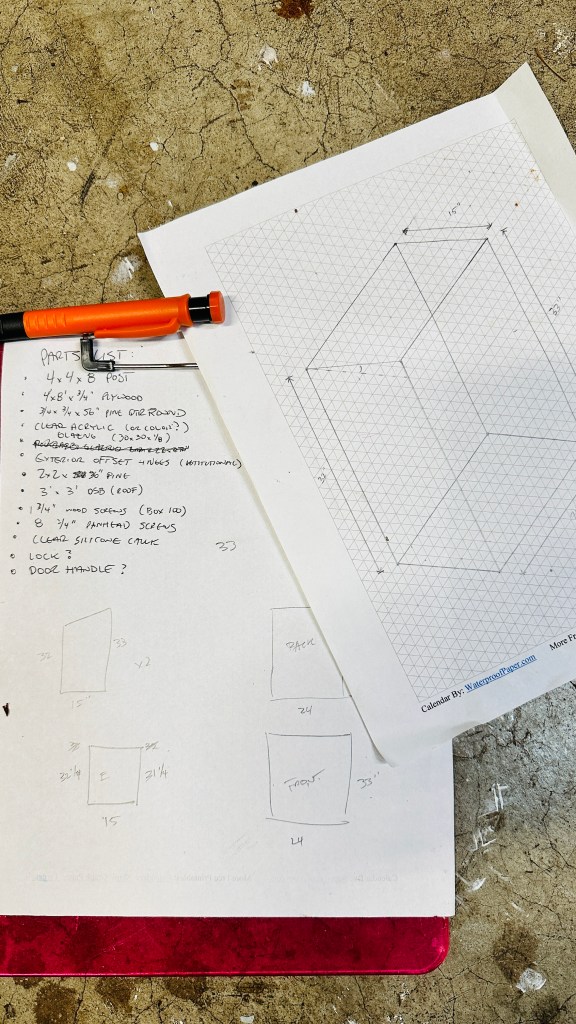 I figured I could get by with one 4″x8″ sheet of maple plywood, and same size OSB for the roof (would. be nice if they made a 4×4 sheet of OSB, just saying)…